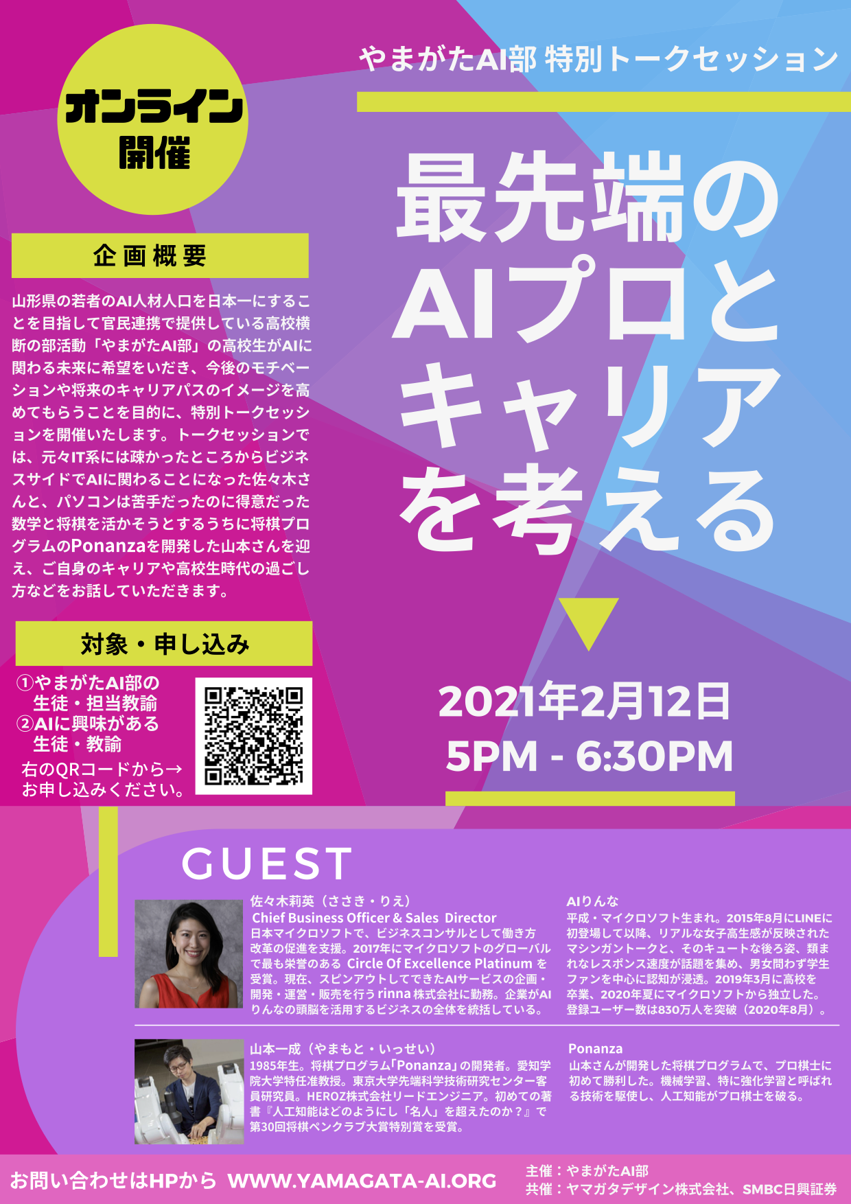 山形県の若者のAI人材人口を日本一にすることを目指して官民連携で提供している高校横断の部活動「やまがたAI部」の高校生がAIに関わる未来に希望をいだき、今後のモチベーションや将来のキャリアパスのイメージを高めてもらうことを目的に、特別トークセッションを開催いたします。
