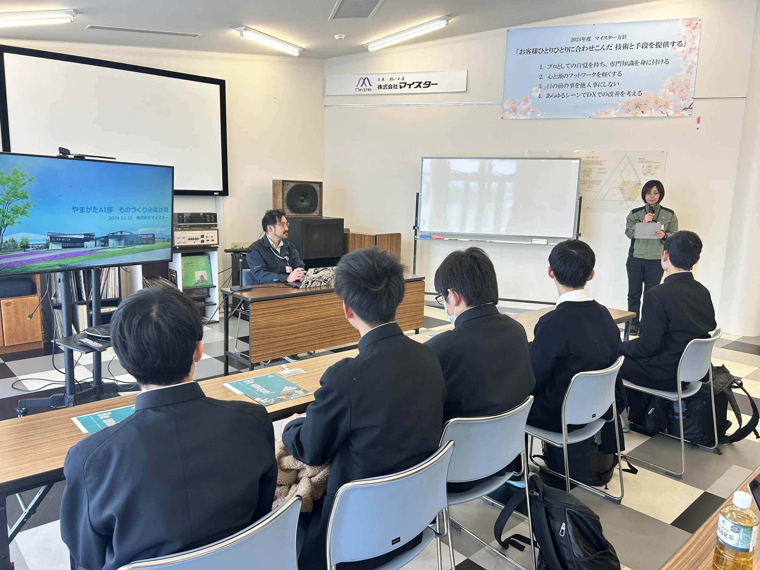 2024年12月25日、やまがたAI部は寒河江市にある株式会社マイスターを訪問しました。本訪問には、ハイメカ株式会社の経営陣や寒河江工業高等学校・寒河江高等学校の生徒が参加し、工場見学とグループワークを通じてAI・DXの現場に触れる貴重な機会となりました。