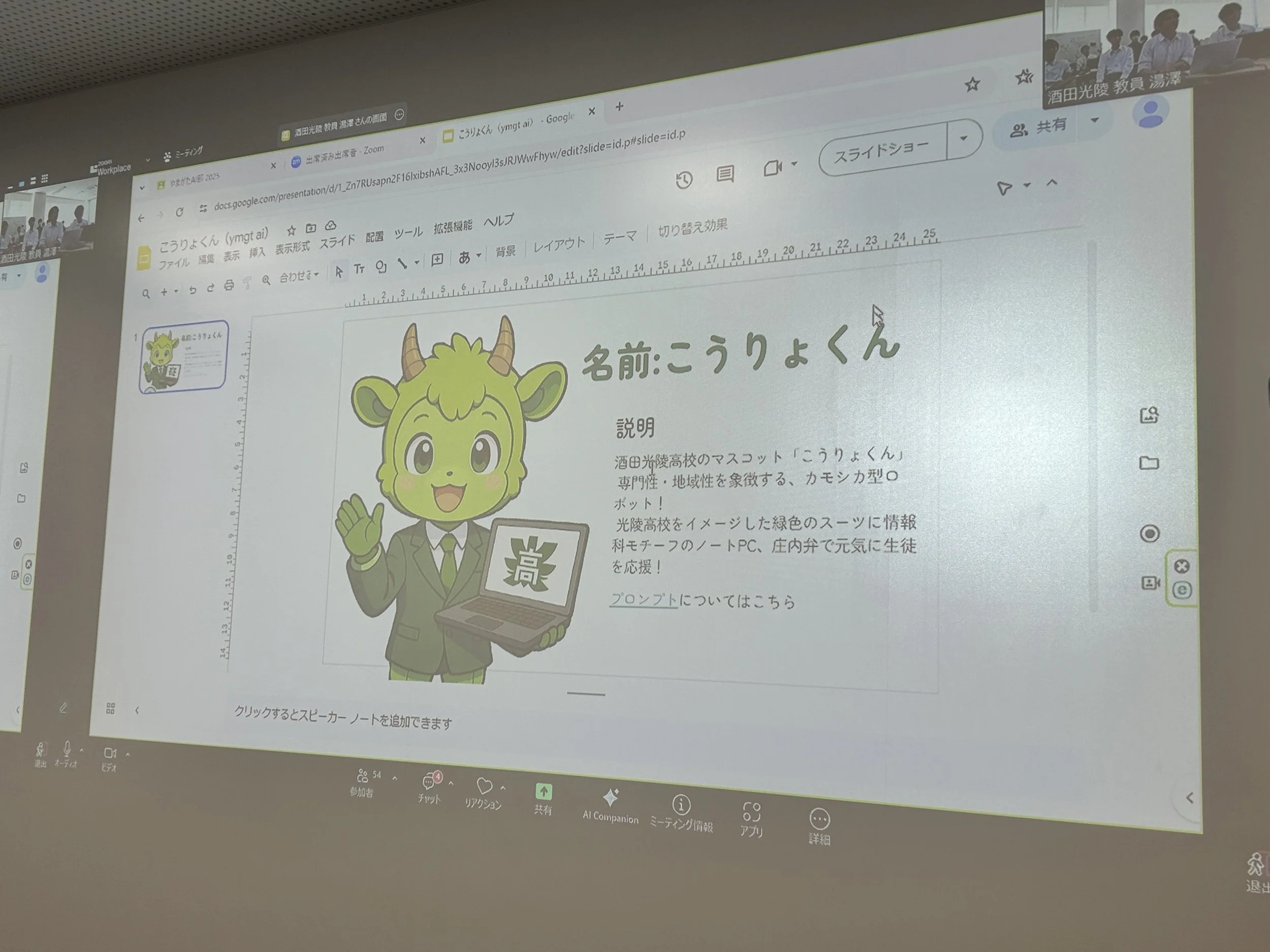 さらに、山形市立商業高校の生徒が企画・準備を行った生成AIを活用したキャラクター制作のデモンストレーションも実施。各校オリジナルのキャラクターを、生成AIの仕組みを活用して創作するアイデアに、参加者一同興味津々。これからのやまがたAI部の活動の可能性を感じさせる、ワクワクする発表でした。