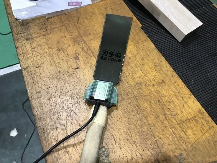 カンナ、ノコギリにモーションセンサーをつけて木材加工のデータ取りです。