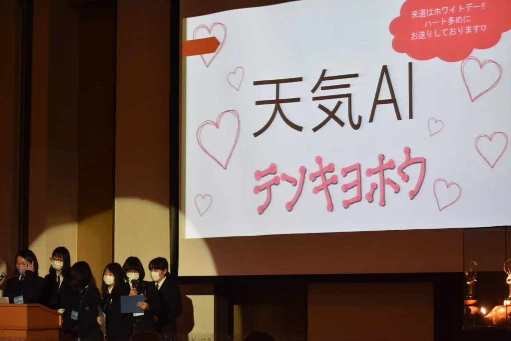 教師ありロジスティック回帰を用いたクラス分類で、過去17年間の気圧、最高気温、最低気温、降水量の合計、平均気温、更に平均湿度を加えて、指定日の天候を予測しました。AIの考え方をしっかり自分たちの言葉で説明できていたことや、AIに学習させるデータ期間の違いで精度がどのように変わるか検証したことなどが審査員から評価されました。