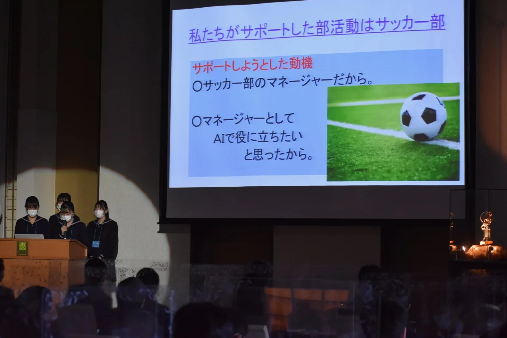 e-sports班を支援するAIについて発表。リーグ・オブ・レジェンドというオンラインゲームをプレイする際に、どういう声掛け要素が成果に結びつくかをAIを用いて分析し、チーム内での「指示」や「報告」ではなく、行動に「反応」する声掛け(ナイス!、了解!等)を行った場合に、うまく敵を倒せることを導き出しました。声掛け数や心拍数をAIに取り込み勝敗との関係を解析した独創性や、作成したAIの精度検証から考察し、精度向上を試みた点などが審査員から評価されました。