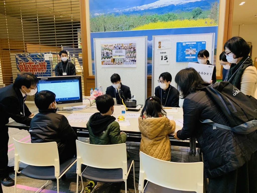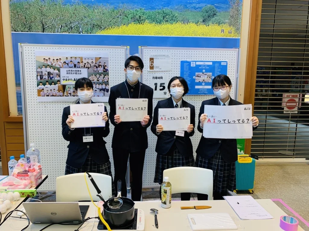 やまがたAI部からは山形県立酒田光陵高等学校の生徒4名と顧問の先生にご参加いただき、AI部の活動でもAI+センシング体験として実施した「ゆでたまごAI」を小中学生の皆さん(以下参加者)に向けて説明、実演していただきました。