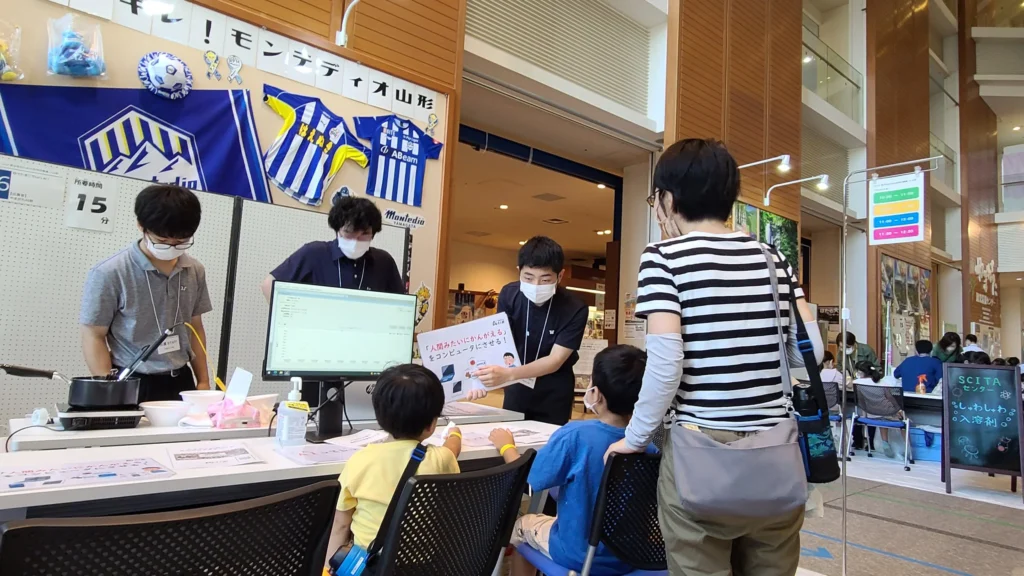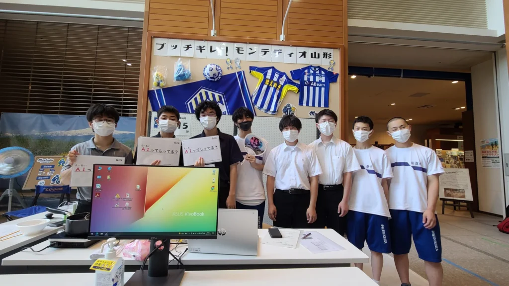 7月30日(土)にやまがた科学・農業体験実行委員会主催の「科学の祭典」が山形市の霞城セントラル1階で開かれ、やまがたAI部の山形県立山形南高校、県立新庄北高校の生徒と顧問の先生が参加しました。
