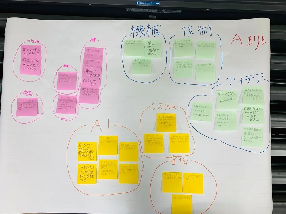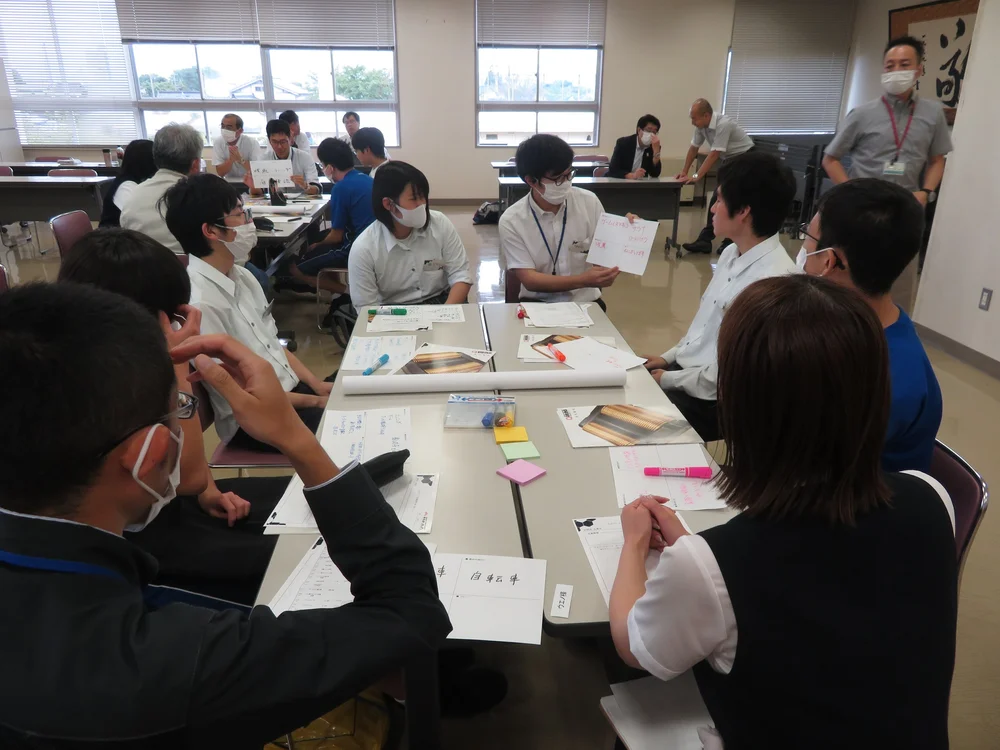 自動巻線機を使用しノイズフィルターコイル、平滑用チョークコイルの設計、製造を行う三川工場を見学後、「ウエノ様におけるAI活用アイデアを出そう」をテーマに3つのグループに分かれグループディスカッションを行いました。最後にどのようなアイデアが出されたのか発表を行うと、「製品のばらつきがない様に製品を識別するAI」や「製造量を確認するAI」などAI活用法のほかに「YouTubeや工場見学を活用し会社の認知を広げる」など多くのアイデアが出されました。