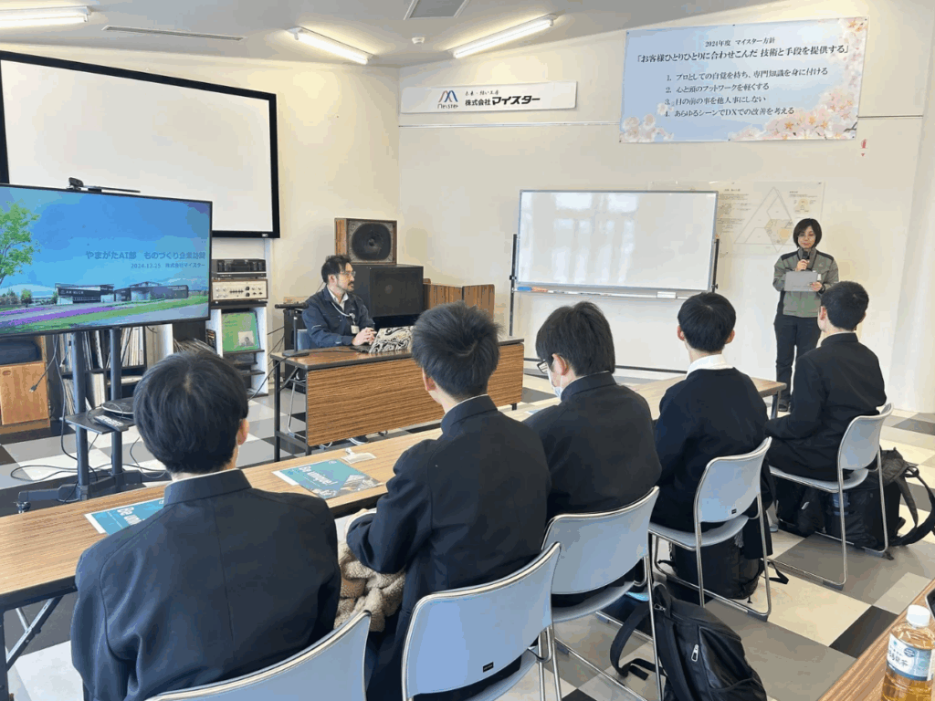 2024年12月25日、やまがたAI部は寒河江市にある株式会社マイスターを訪問しました。本訪問には、ハイメカ株式会社の経営陣や寒河江工業高等学校・寒河江高等学校の生徒が参加し、工場見学とグループワークを通じてAI・DXの現場に触れる貴重な機会となりました。