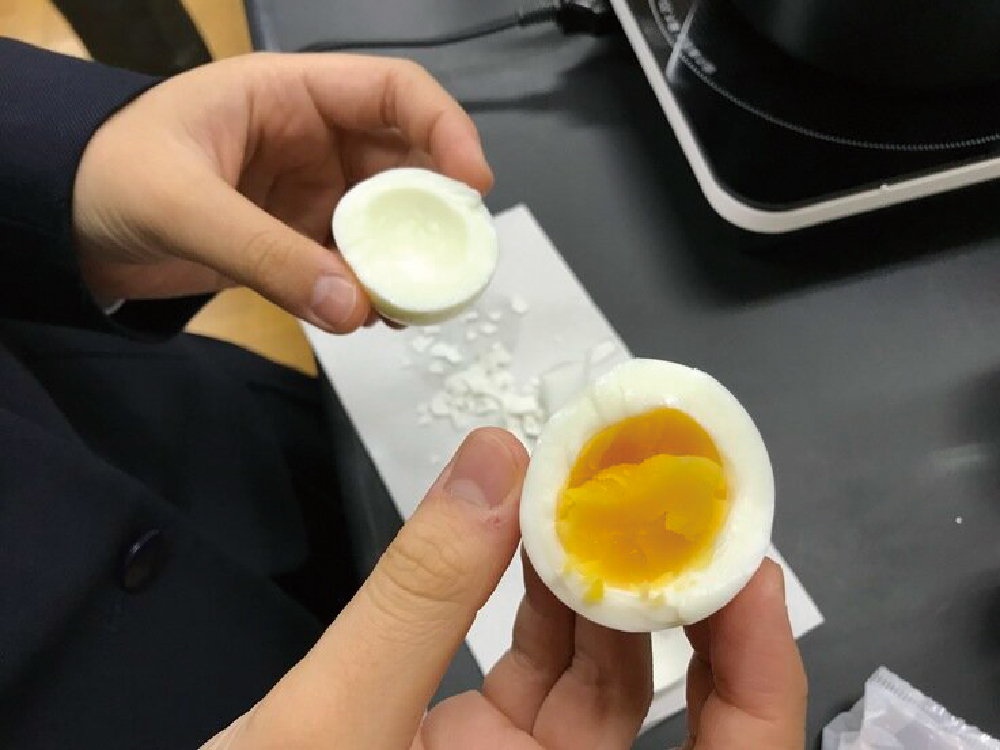 卵を茹でる湯温の変化から黄身の半熟度合いをAIで予測する実験です。