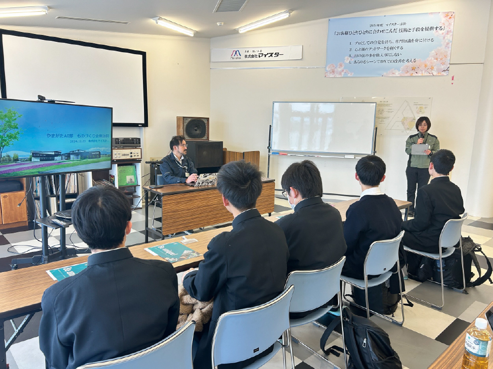 やまがたAI部では、県内のものづくり企業を中心に地元の企業訪問し、AIが実際にどのように活用されているかを現場で学びます。単なる見学ではなく、生徒自らがAI導入・活用の具体的なアイディアを提案する場が設けられており、より深く仕事の内容を理解することができます。
