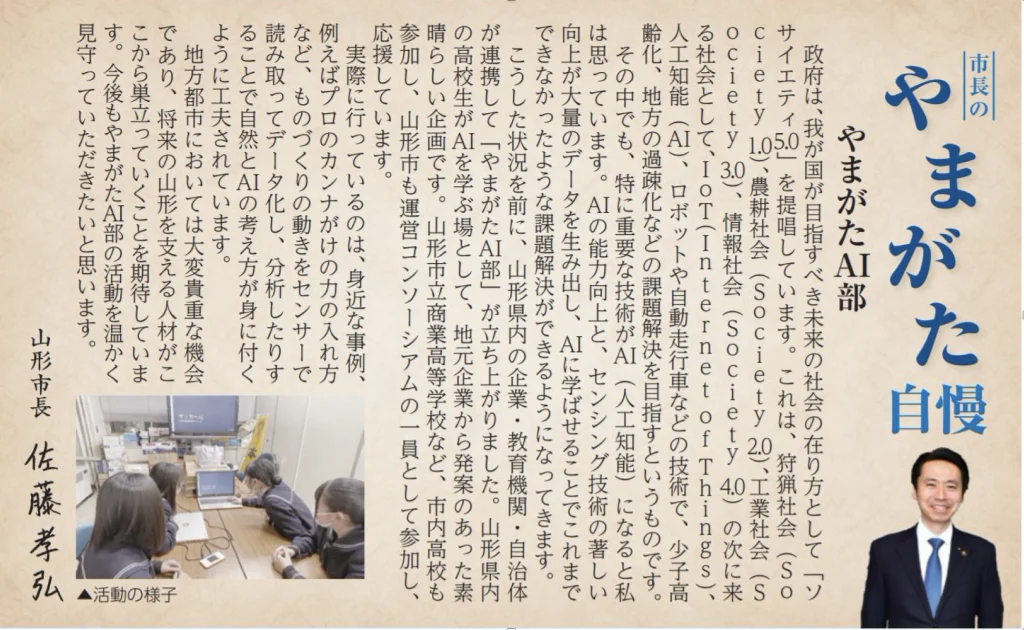 広報やまがた(山形市報)令和3年3月1日号の「市長のやまがた自慢」コーナーでやまがたAI部の活動を紹介いただきました。